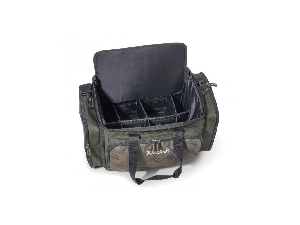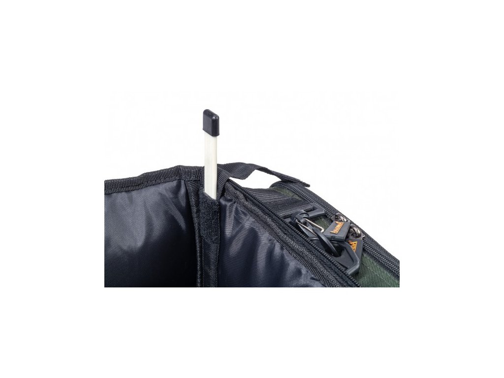 Multifunkční taška na rybářské potřeby. Dostatečný prostor, spousta kapes a 5 organizačních boxů umožňuje bezpečné přenášení rybářského vybavení. Stěny tašky mají vzpěry a drží stejný tvar, vrchní část je vyztužena a proto ji lze použít jako stoleček. Na vrchní části je elastickými pásky připevněn organizační box. Uvnitř tašky je organizér, v přední kapse jsou umístěny další organizační boxy. Součástí tašky je i 9 plastových dóz s gumovým těsněním na dipované nástrahy. Taška má praktická ucha a polstrovaný ramenní popruh.- Rozměry: 53 x 35 x 40 cm