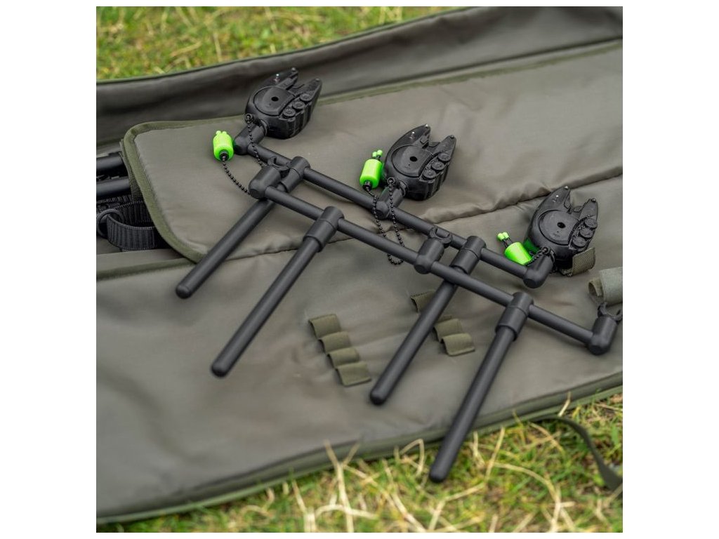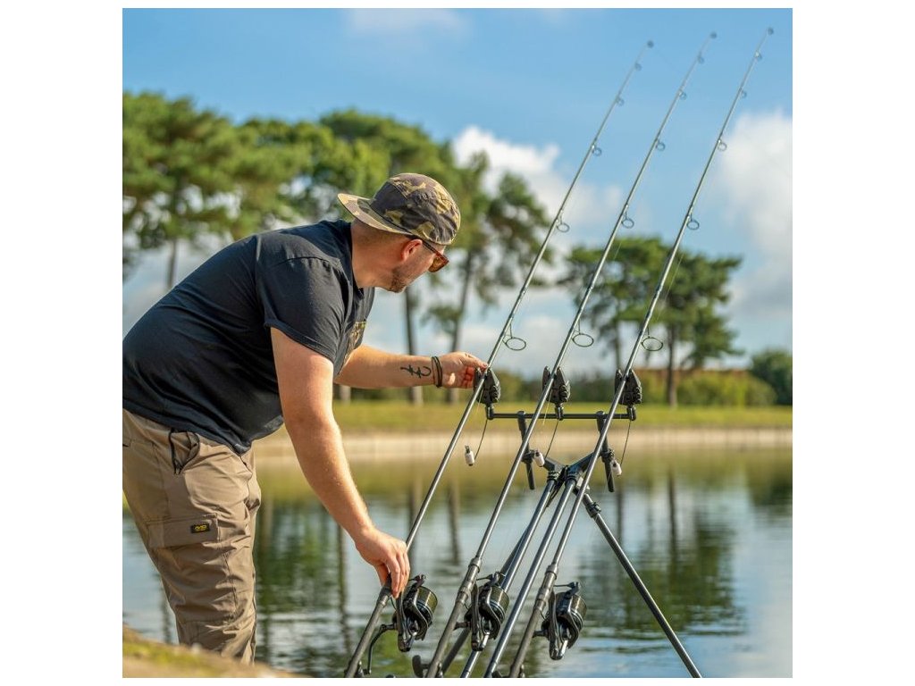 Stojan nabízí široké možnosti nastavení – délku, výšku i úhly nohou lze upravit podle potřeby, od klasického horizontálního postavení až po agresivní „sniper style“ zaměřený na dlouhé hody. Silné teleskopické nohy zajišťují pevnou oporu, zatímco pevné buzzbary drží pruty stabilně i při prudkých záběrech. Celý stojan se rychle skládá a balí do kompaktního transportního pouzdra.