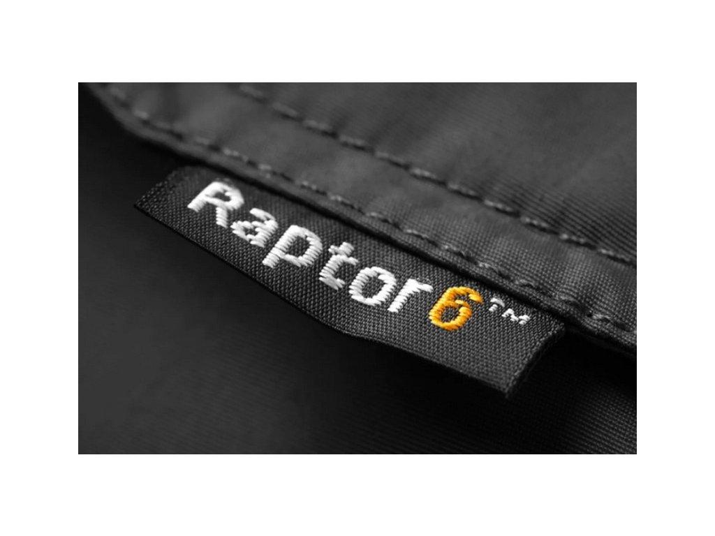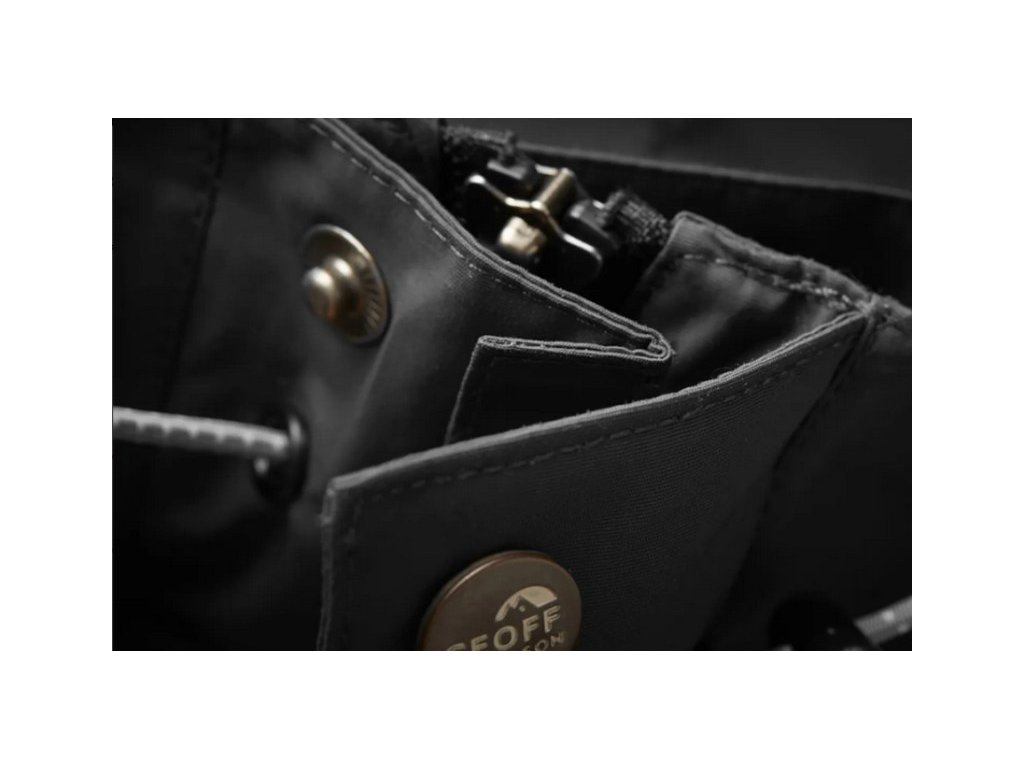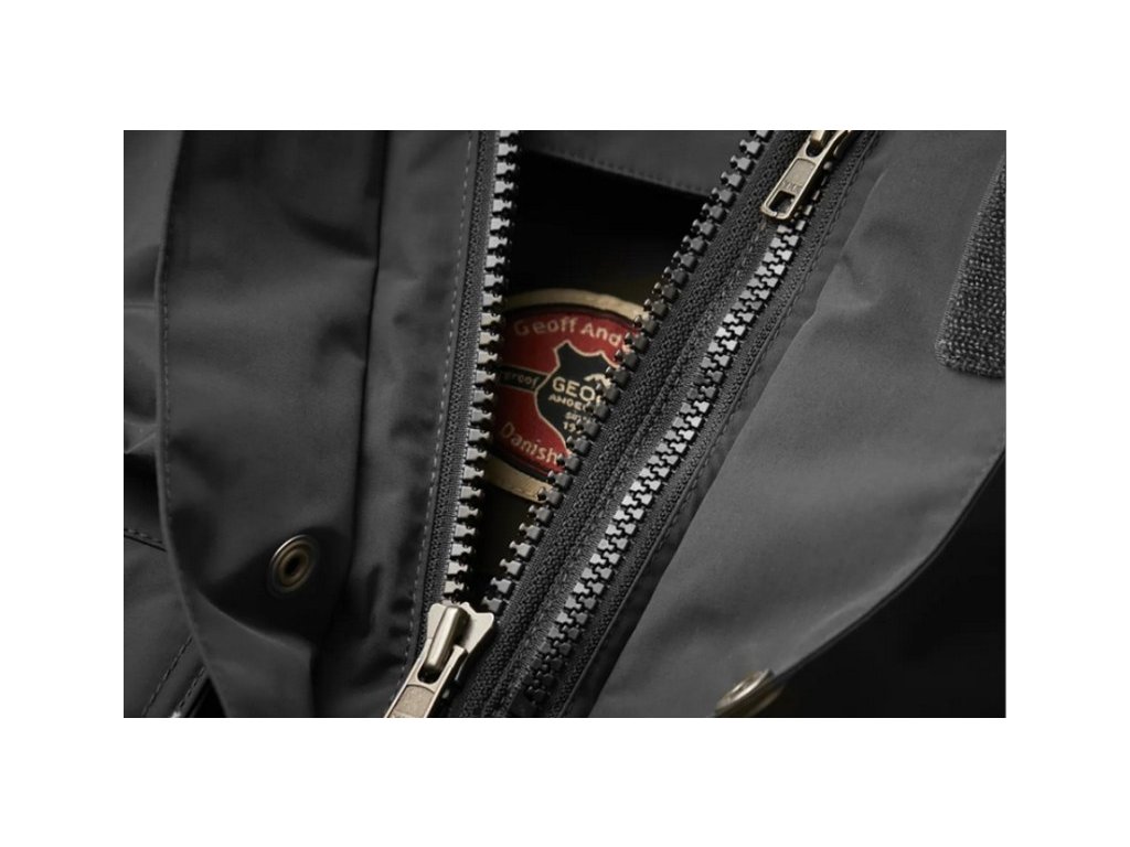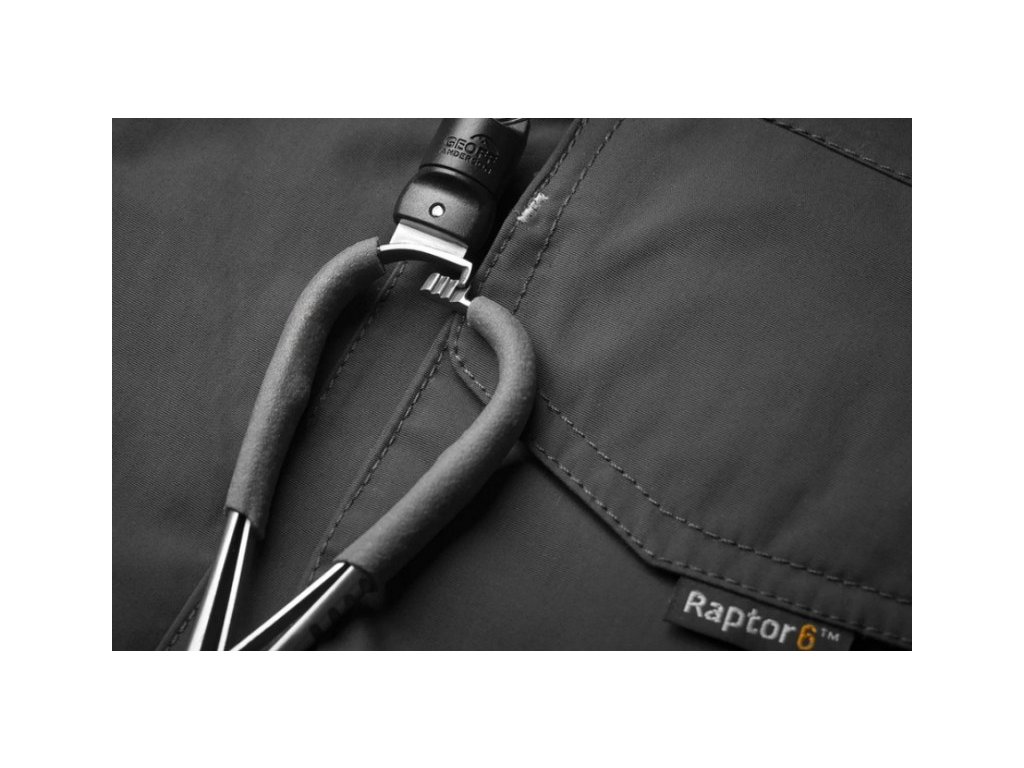Přední část bundy Geoff Anderson Raptor 6 obsahuje dvě velké náprsní kapsy, které se těsně zavírají a chrání obsah před deštěm a vlhkostí. Ideální pro ukládání krabiček s nástrahami nebo pro nástroje, které potřebujete mít po ruce. Také na přední straně je malá upevňovací smyčka ideální pro osazení rybářského peanu nebo kleští. Napoleonská kapsa (vnitřní kapsa), kterou lze ovládat bez rozepínání bundy. Na zadní straně se nachází prostorná kapsa do které se vejde mapa, láhev s vodou nebo jiné potřebné příslušenství. Robustní zip je chráněn dvojitým překrytím na suchý zip a nerezovými knoflíčky.