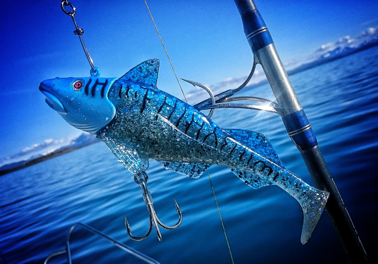 Po chvíli pozorování toho krásného zvířete jsme sáhli po prutech a nasadili své nejúspěšnější nástrahy celého týdne. Na sonaru se nám ukazovaly ryby kousek nade dnem a celí napjatí jsme čekali na první bouchnutí do prutu. To dostali kluci z vedlejší lodě a začali masakrovat všichni najednou. Krásně trefili hejno tresek a měli tak o zábavu postaráno. My na ně jen napjatě koukali a snažili se k nim přiblížit. Během chvíle dostal první záběr Robert a zdolával pěknou rybu. Ta si brala krásně z cívky a jela si svým směrem ke dnu. Podle tahu to vypadalo na pořádně velikou tresku obecnou. Bohužel po chvíli se ryba vyřízne a Robert tak ztrácí svoji zatím největší rybu na prutu. Je z toho dost zklamaný, ale nedá se nic dělat. Nezbývá, něž nahodit a zkoušet štěstí znovu. Ihned na to seká Karlos svůj ohnutý prut. Na tom měl nastraženého živého kelera osazeného trojháky. Ryba je na prutu a celkem i pěkně bojuje. Zanedlouho se u lodi vynořila Obecňačka lehce k metru a měla celou cca 40cm nástrahu krásně v sobě. Na druhé lodi je vidět dobrá nálada, po které přichází hlasitý výkřik ,,Kur...“. Tom měl na prutu těžkou rybu, kterou nemohl zastavit a bohužel mu povolil 1mm silný rozedřený návazec silonu. Krátké vyčítání si svých chyb při zdolávání, ale jdeme dál, dokud to bere. Ztráta velké ryby vždy mrzí, a nezbývá nic jiného, něž na to raději nemyslet a spravit si náladu jiným úlovkem. Asi tak hodinu na to máme v lodi několik tresek přibližně stejné velikosti, kolem 90cm, a kolegové vedle nás jsou na tom o něco lépe, co se množství ryb týče.