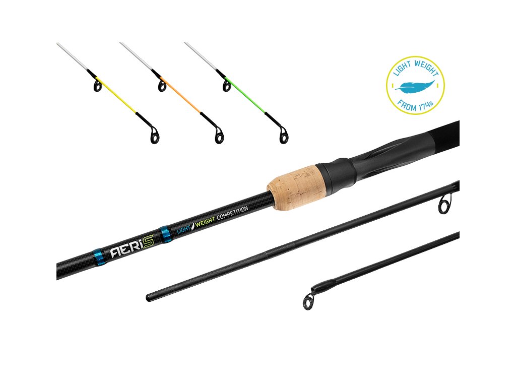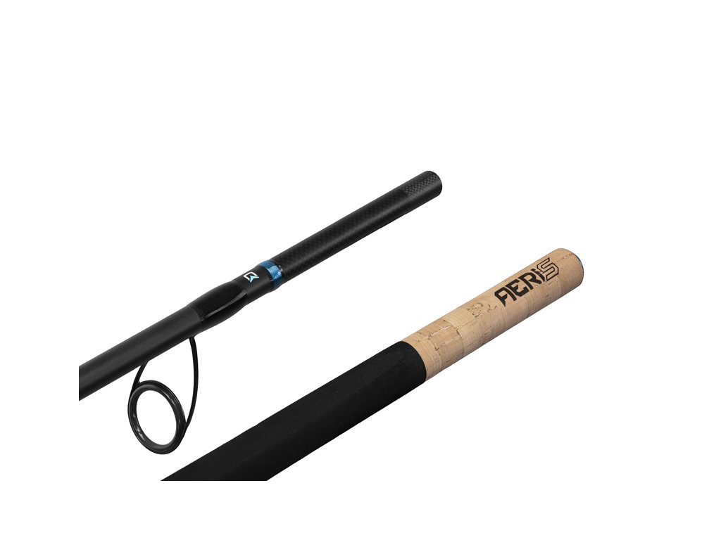 Pěna je navíc seříznuta tak, aby rukojeť dokonale přilnula k předloktí během zdolávání ryb. Karbonová struktura na části blanku či ve výřezu sedla, modré detaily a efektní nápis AERIS na korku rukojeti, vytvářejí originální elegantně sportovní design, který si spolu s technickými parametry prutu podmaní množství příznivců feederového lovu. V základu je prut dodáván se třemi karbonovými špičkami s označením Ultra Light, Light a Medium.