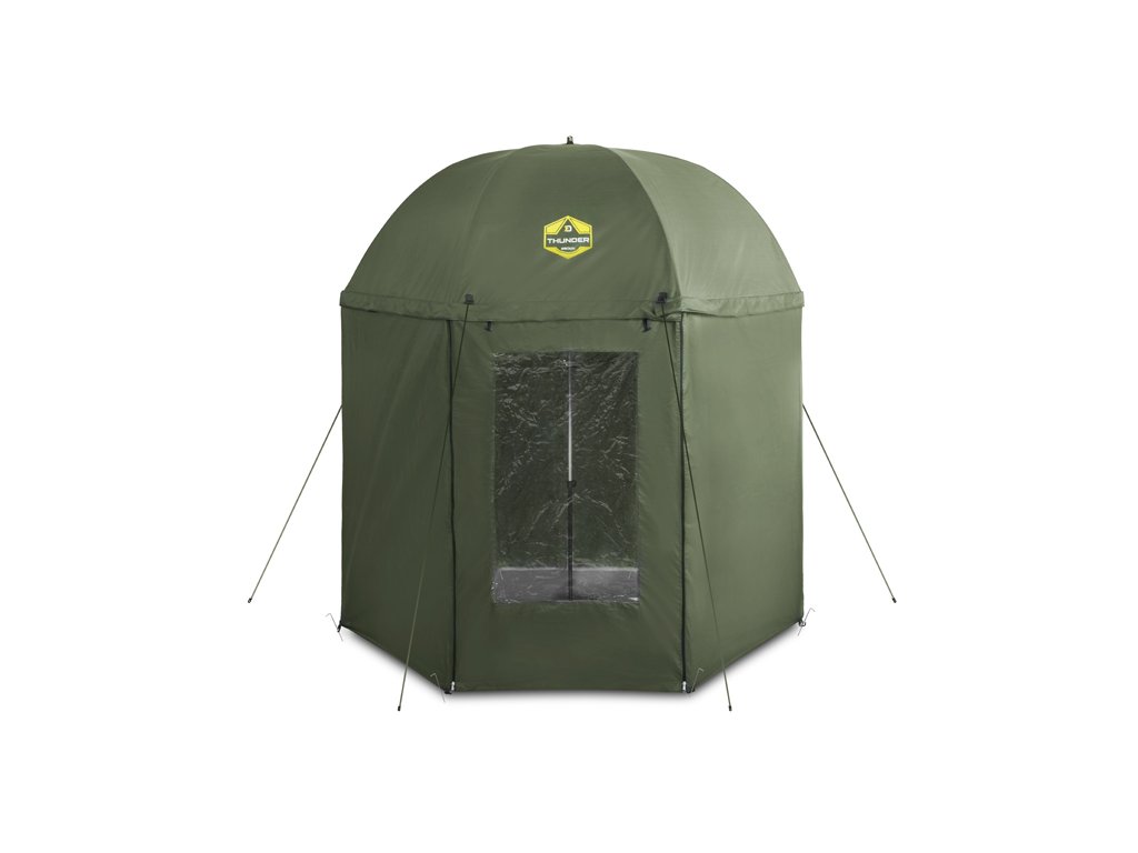 Deštník s bočnicí DELPHIN THUNDER FullWALLDeštník s kompletně uzavíratelnou bočnicí Delphin THUNDER FullWALL je ideální volbou do nepříznivého počasí během kratších výprav. Perfektně ochrání před nepříjemným sluncem, ranní rosou, ale i vyšším úhrnem srážek. Pro lepší stabilitu ve větru je opatřen čtyřmi ukotvovacími lany. Švy deštníku jsou důkladně podlepeny voděodolnou páskou pro zajištění 100% nepromokavosti i v případě silného deště. Díky boční prodloužené stěně po celém obvodu budete před nepříznivými podmínkami chráněni ze všech stran. Bočnice disponuje dveřmi, které jsou opatřeny kvalitními zipy. Kromě toho se na dveřích nachází průhledné plastové okno, díky kterému budete z deštníku vidět na pruty i za deště. Spodní část boční stěny je osazena úchyty pro připevnění k zemi pomocí zajišťovacích kolíků, které jsou součástí balení. Výšku a sklon deštníku lze přizpůsobit podle potřeby, což zároveň usnadní jeho upevnění i v členitějším terénu.