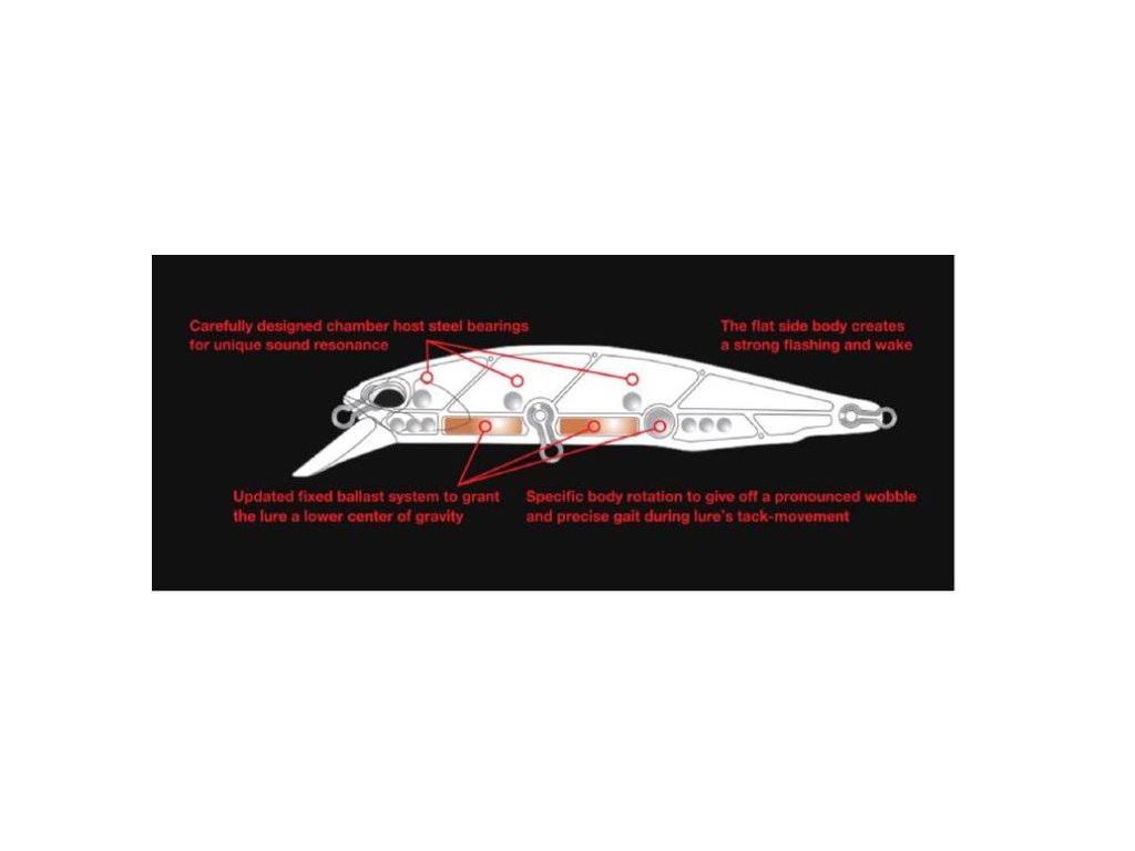 Tělo wobleru je dokonale vyvážené pro dlouhé a přesné hody, i za větrného počasí. Díky absenci vnitřního rolovacího systému nevydává žádné zvuky – ideální pro opatrné ryby, které již nereagují na klasické hlasité nástrahy. Přirozený chod s jemnými odlesky a plynulými výkyvy v bocích imituje zraněnou rybku.