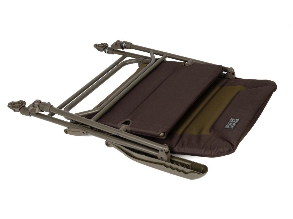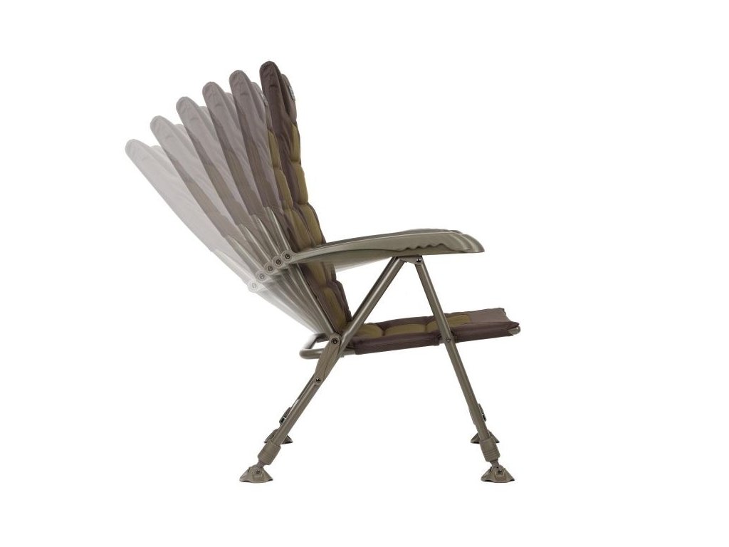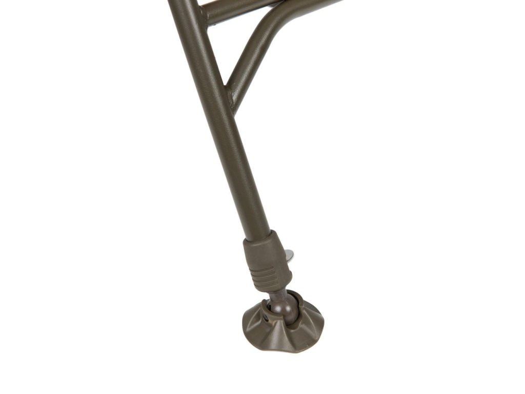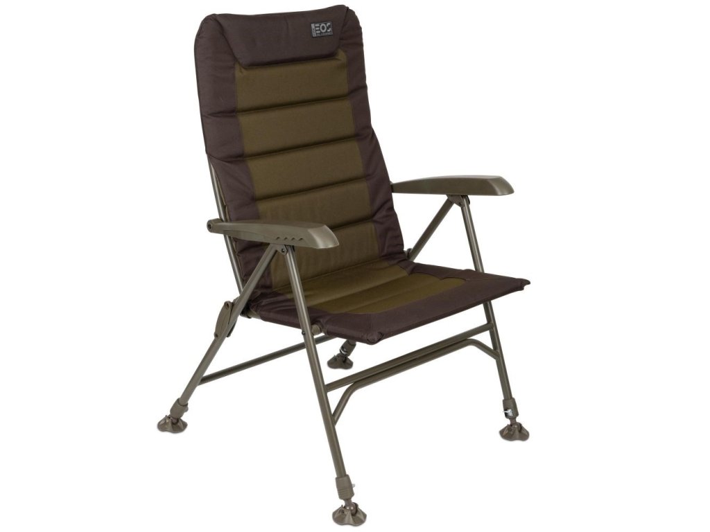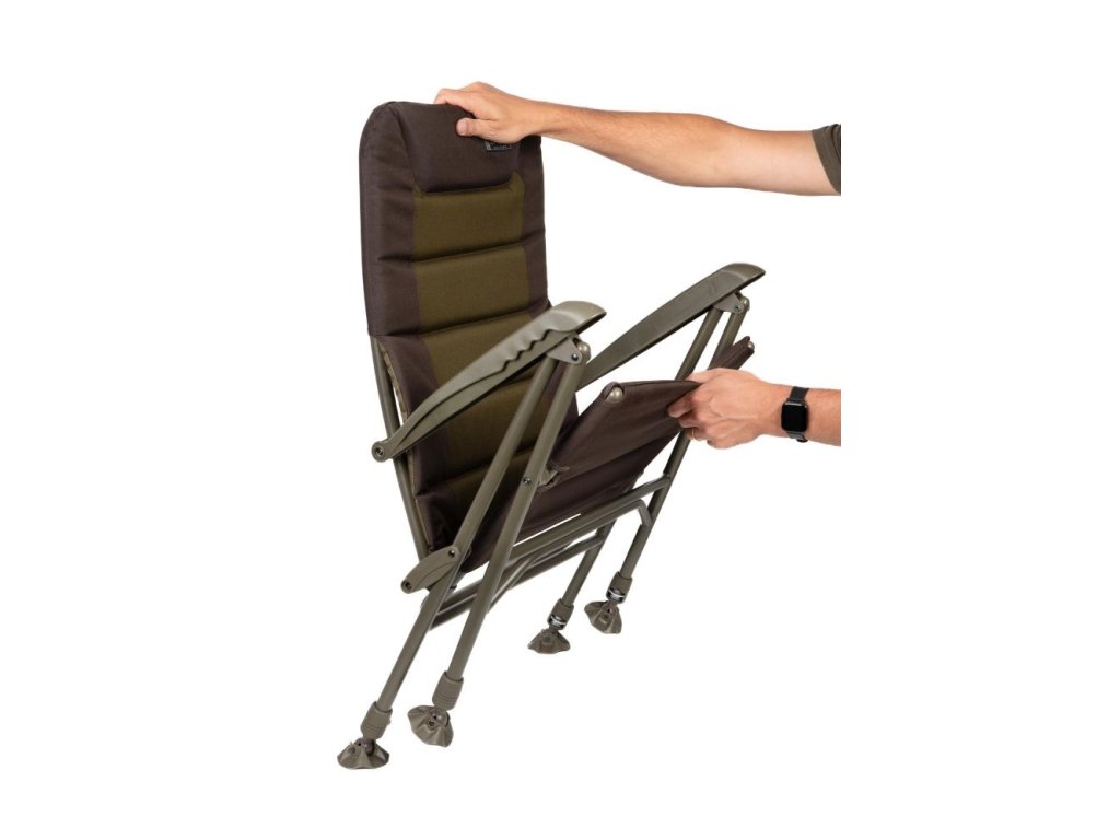 je rybářské křeslo ve standardní velikosti určené pro kaprařinu, feeder i delší pobyt u vody, kde je potřeba stabilní posed a možnost přizpůsobit se terénu. Opěrka zad je polohovatelná, takže si nastavíš sklon podle způsobu chytání a práce u prutů, a polstrovaný potah s područkami zjednodušuje dlouhé sezení. Čtyři nohy jsou výškově nastavitelné a zakončené otočnými patkami proti zaboření, což pomáhá při stavění na měkkém břehu, štěrku nebo nerovnostech. Křeslo se skládá do plochého transportního tvaru, takže se vejde do běžné kaprařské výbavy a snadno se převáží.