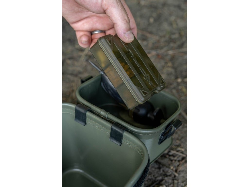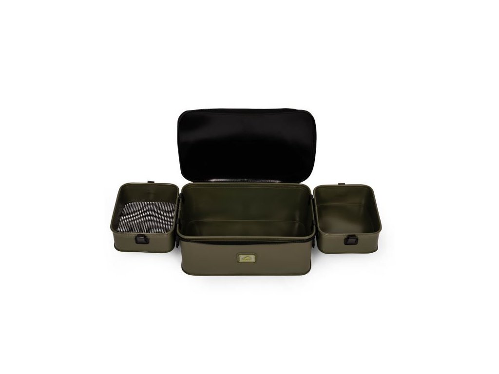 je kompaktní EVA taška určená pro přehledné uložení návnad, nástrah a drobného feederového či „coarse“ vybavení na jednom místě. Uvnitř má dvě vyjímatelné vložky, které oddělí drobnosti od návnad a usnadní práci u vody; jedna vložka je osazená 3mm sítem pro prosévání živých nástrah nebo krmení. Vložky lze během chytání připnout na vnější stranu tašky a vytvořit si tak praktickou pracovní plochu, zatímco pod nimi zůstává prostor pro vaničky s návnadou, krabičky a další nástrahy. EVA materiál je nepromokavý a snadno omyvatelný, takže se hodí i pro mokré a špinavé návnady, a odolný zip i ramenní popruh zjednoduší přenos mezi místy.