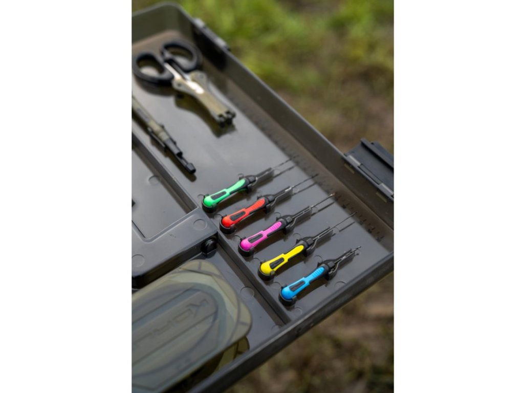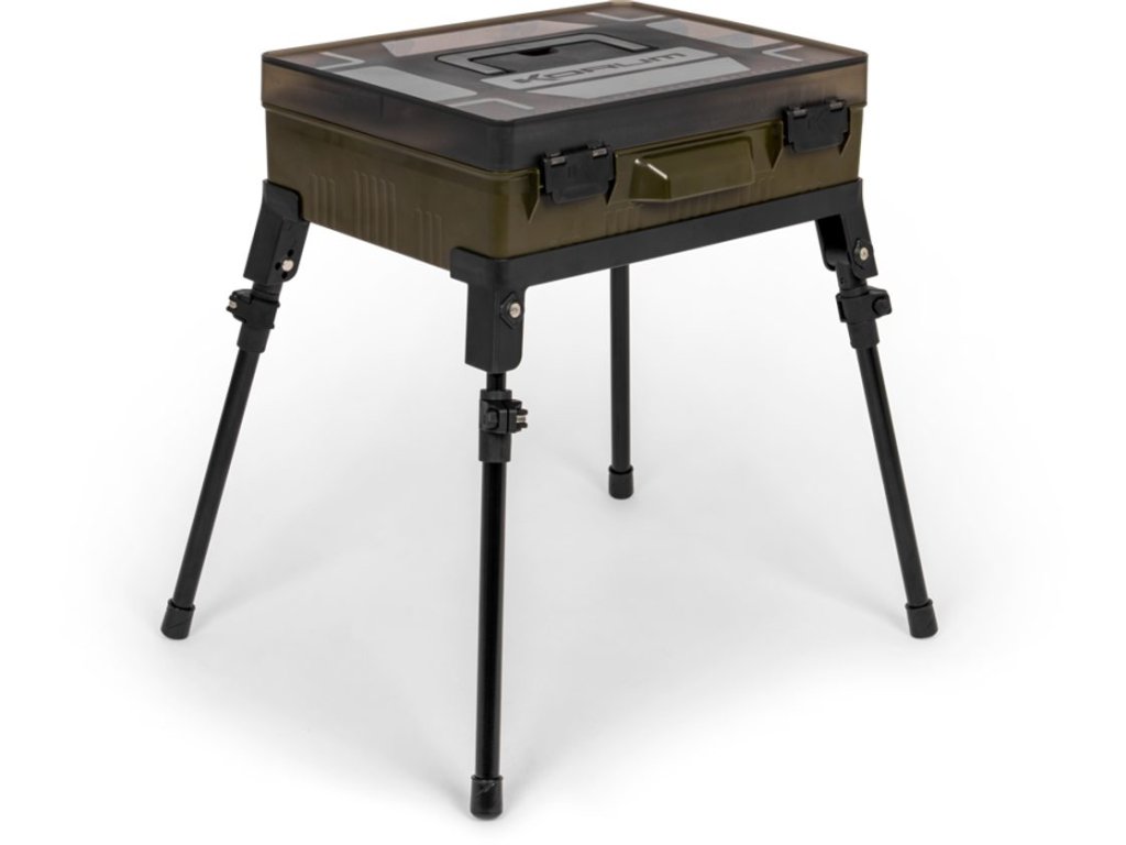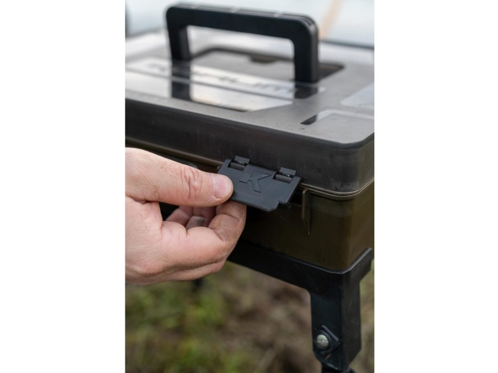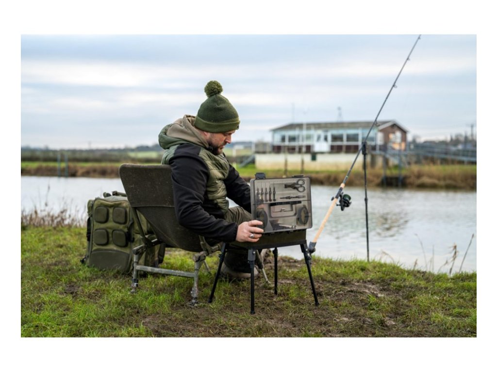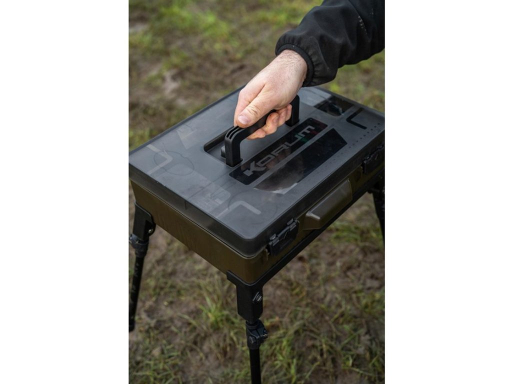 Korum Box Mega Blox Station Fully Loaded je samostatně stojící úložný box pro rybářskou bižuterii, nástroje a hotové návazce, který udrží drobné komponenty přehledně na jednom místě i při práci na břehu. Vnitřní prostor je navržen pro ukládání cívek s vlascem, háčků a dalšího příslušenství a lze jej rozdělit nastavitelnými přepážkami podle velikosti uložených dílů. Nástroje jako jehly, vyprošťovač háčků a nůžky mají vyhrazené pozice, takže se při vázání a úpravách návazců nemusí nic hledat. Víko obsahuje dva mělké boxy Slim Rig Blox pro bezpečné uložení hotových návazců v suchu, box je utěsněný, zavírání je jištěné klipy a nechybí měřítko pro přesné vázání. Součástí jsou teleskopické nohy, díky kterým lze stanici postavit do výšky a mít obsah v dosahu při sezení na židli nebo ji stabilně používat u bivaku; pro přenos slouží pevné madlo a boční rukojeť. V balení je 5× jehla na nástrahy, 1× vyprošťovač háčků, 1× nůžky, 2× Slim Rig Blox, 4× hluboké přihrádky, 9× nastavitelné dělené sekce, 1× dlouhá úložná sekce a 4× teleskopické nohy Power Cam.