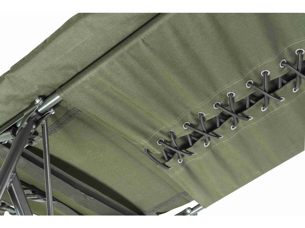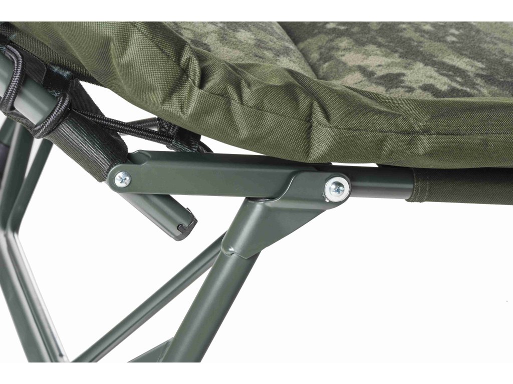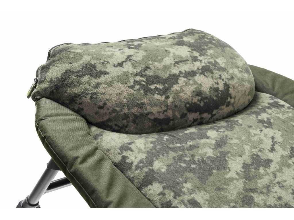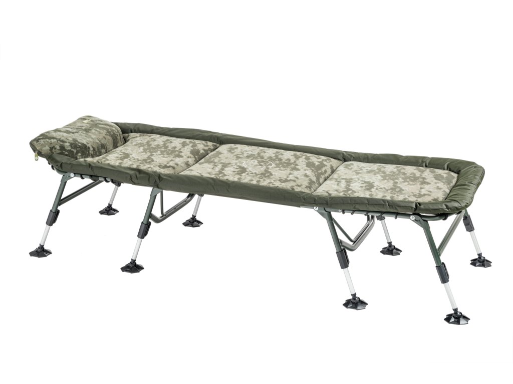 Extrémně lehké, velké a 100% ploché lehátko ve velice atraktivním designu s digitálním maskováním. Nadstandardně silná a velmi komfortní matrace s fleecovou vrchní vrstvou nabízí nejúčinnější systém regulace tuhosti pomocí elastického šněrování na spodní straně. Další výhodou jsou nohy s rozměrnými výkyvnými patkami a možností velkého vysunutí. Lehátko je dostupné ve variantě s osmi nebo se šesti nohami.Polštář = délka - 30 cm, šířka - 65 cm, výška - 15 cm
