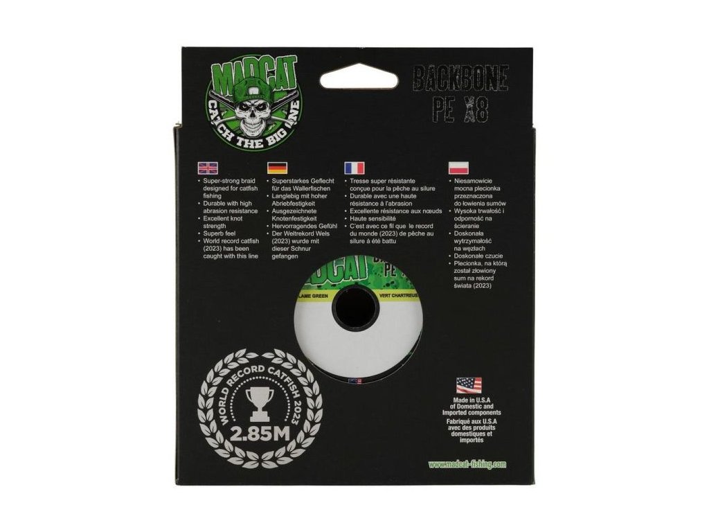 MADCAT Backbone PE X8 300m Flame Green Chartreuse je špičková pletená šňůra navržená speciálně pro lov sumců a dalších velkých dravých ryb. Tato vysoce výkonná šňůra poskytuje maximální pevnost, odolnost a viditelnost, což z ní činí ideální volbu pro náročné rybářské podmínky. Ideální pro lov sumců, štik, candátů a dalších velkých dravých ryb. 8-pramenná pletená šňůra poskytující hladký povrch a vysokou citlivost. Vysoká pevnost v tahu pro spolehlivost při lovu velkých ryb. Vynikající odolnost proti oděru a UV záření.