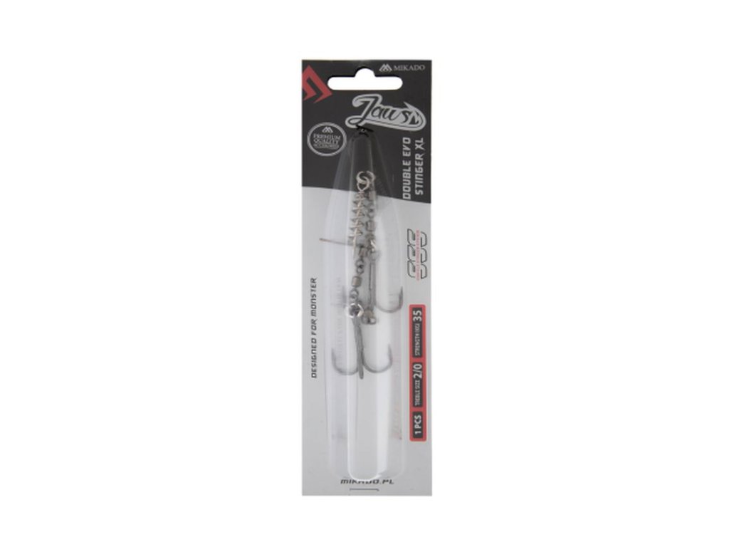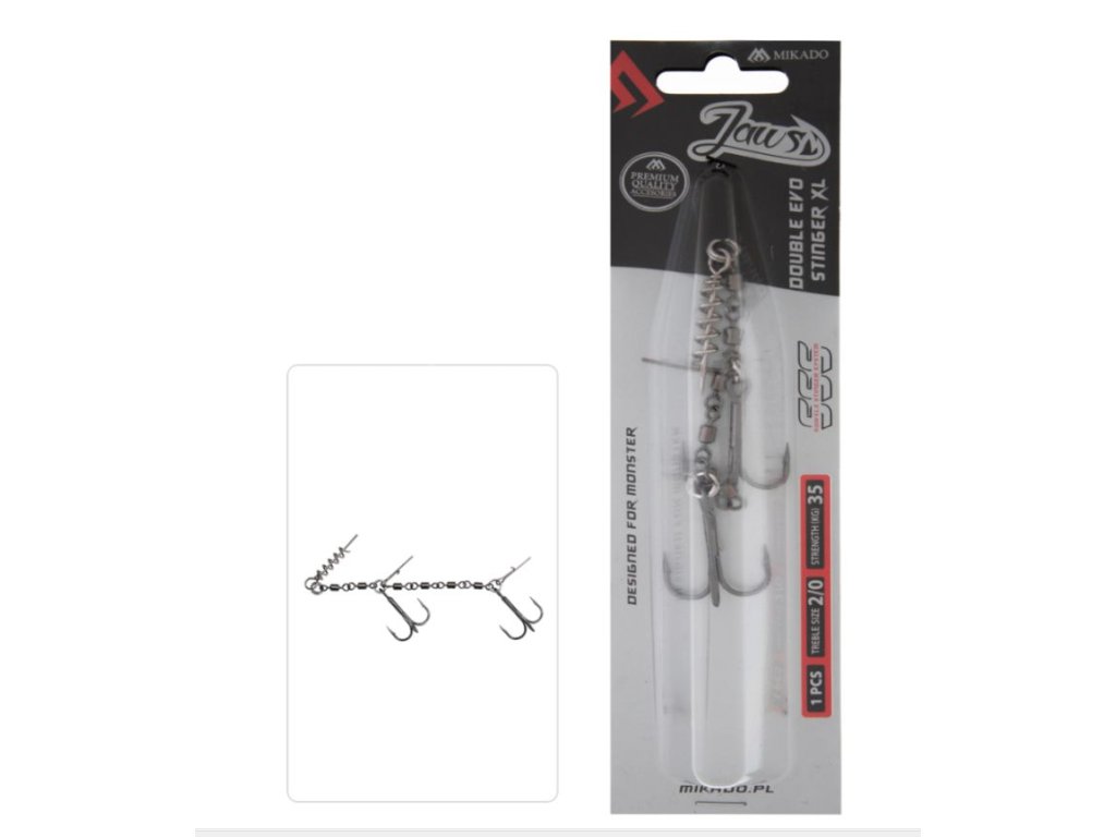 MIKADO Stinger Jaws Double Evo XL 35kg 2/0 je robustní stinger (přídavný návazec) určený pro cílený lov velkých dravců, zejména štik a sumců. Je vyroben z extrémně pevného ocelového lanka o nosnosti 35 kg a osazen dvěma ostrými trojháčky velikosti 2/0. Konstrukce s dvojitými háčky zajišťuje vyšší úspěšnost záseku i při opatrných záběrech.
