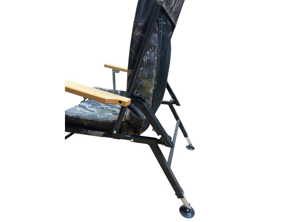 Produkt vyniká silným polstrováním v maskáčovém vzoru, které zvyšuje pohodlí a zároveň dobře splyne s přírodním okolím. Konstrukce zajišťuje vysokou pevnost a dlouhou životnost, přičemž hmotnost pouhých 6,5 kg umožňuje snadné přenášení. Teleskopické přední nohy s talířovými patkami se výborně přizpůsobují nerovnému terénu a poskytují stabilitu i na měkkém povrchu. Dřevěné područky přispívají k lepšímu komfortu a příjemnému pocitu při sezení.