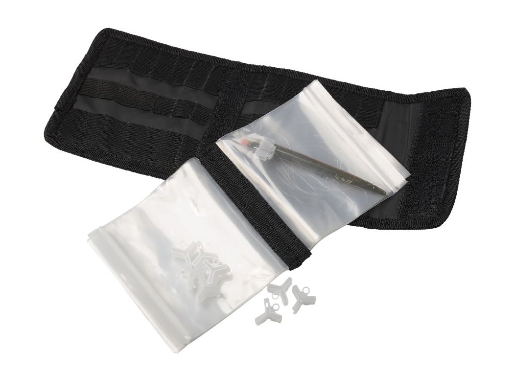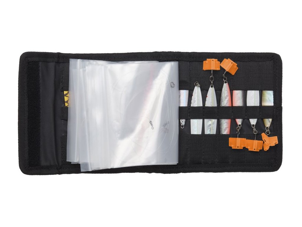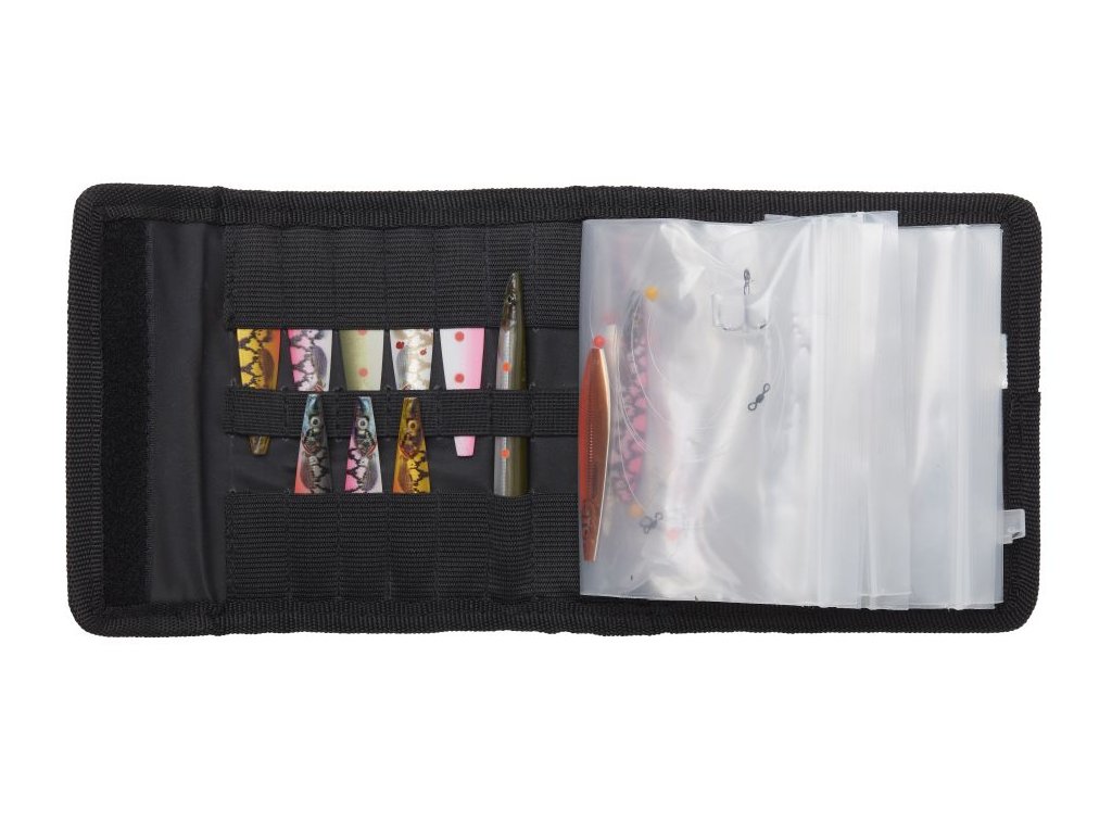 je kompaktní „flip“ peněženka pro přívlač, určená na hotové návazce a menší nástrahy, typicky Line Thru. Uvnitř má elastické dělení a 14 pružných pozic, kam se ukládají nástrahy do délky cca 13 cm, aby držely odděleně a neodíraly se. Pro už navázané nástrahy nebo samotné lankové návazce slouží 8 vyjímatelných průhledných sáčků se zipem (do cca 12,5 cm), takže máte montáže připravené a zároveň chráněné před zamotáním. Součástí je i 8 chráničů trojháčků pro velikosti #8 až #5, které snižují riziko zachycení o látku a další výbavu. Pouzdro je z odolné 600D tkaniny s vnitřní podšívkou a velikostně je navržené tak, aby se vešlo do kapes brodicí bundy při aktivním chytání.