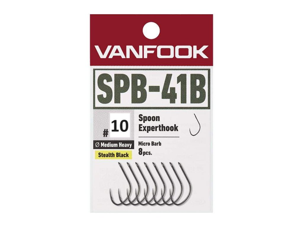 jsou jednoháčky navržené pro osazení pstruhových plandavek (spoonů), kde je důležitý rychlý zásek a jisté držení ryby při zdolávání. Model SPB-41B používá pevnější drát (medium heavy) pro stabilní práci s nástrahou a spolehlivý průnik, přičemž mikro protihrot pomáhá omezit vyříznutí háčku při výpadech. Tvar s užším obloučkem a zahnutým hrotem je laděný tak, aby háček dobře „seděl“ v tlamce a minimalizoval ztráty, a větší očko usnadňuje montáž na kroužek u plandavky. Povrch v barvě Stealth Black je nenápadný ve vodě a hodí se pro jemnou přívlač na pstruhy na tekoucích i stojatých vodách.